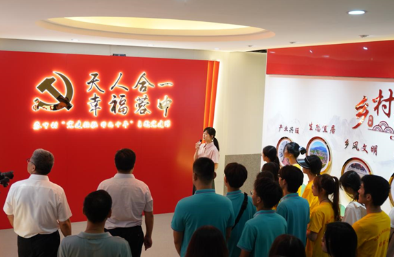 蓉中村牢牢抓住党建引领这一根本,突出"党委领头开路引领发展、党员认领项目带头发展、各方联建联促借力发展、群众主动参与持续发展" 四个发展理念,着力打造"共建大邻里,幸福小邻里"党建品牌。联学共研实践团队实地调研 "天人合一 幸福蓉中"党建馆,深入学习了蓉中村在过去十年中在党建引领、经济发展、文化引领、社会治理、环境保护以及促进共同富裕等方面所取得的实践经验和发展成果。大家表示,蓉中村经过十余年的开发建设,探索出一条"党建统领、经济先行、全面发展、强村富民"的发展道路,离不开村党委建设模式的探索,更离不开基层党组织的战斗堡垒作用和党员的模范带头作用,作为青年学生要以理论专业知识武装头脑,听党话、跟党走,肩负时代的使命,扛起乡村振兴的大旗。