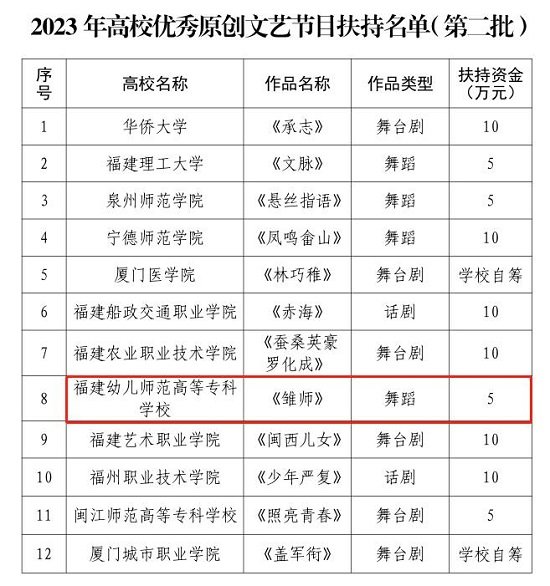 2023年9月13日,福建省教育厅办公室公布了2023年高校优秀原创文艺节目扶持名单,学前教育学院申报的原创舞蹈作品《雏师》列入第二批扶持范围。