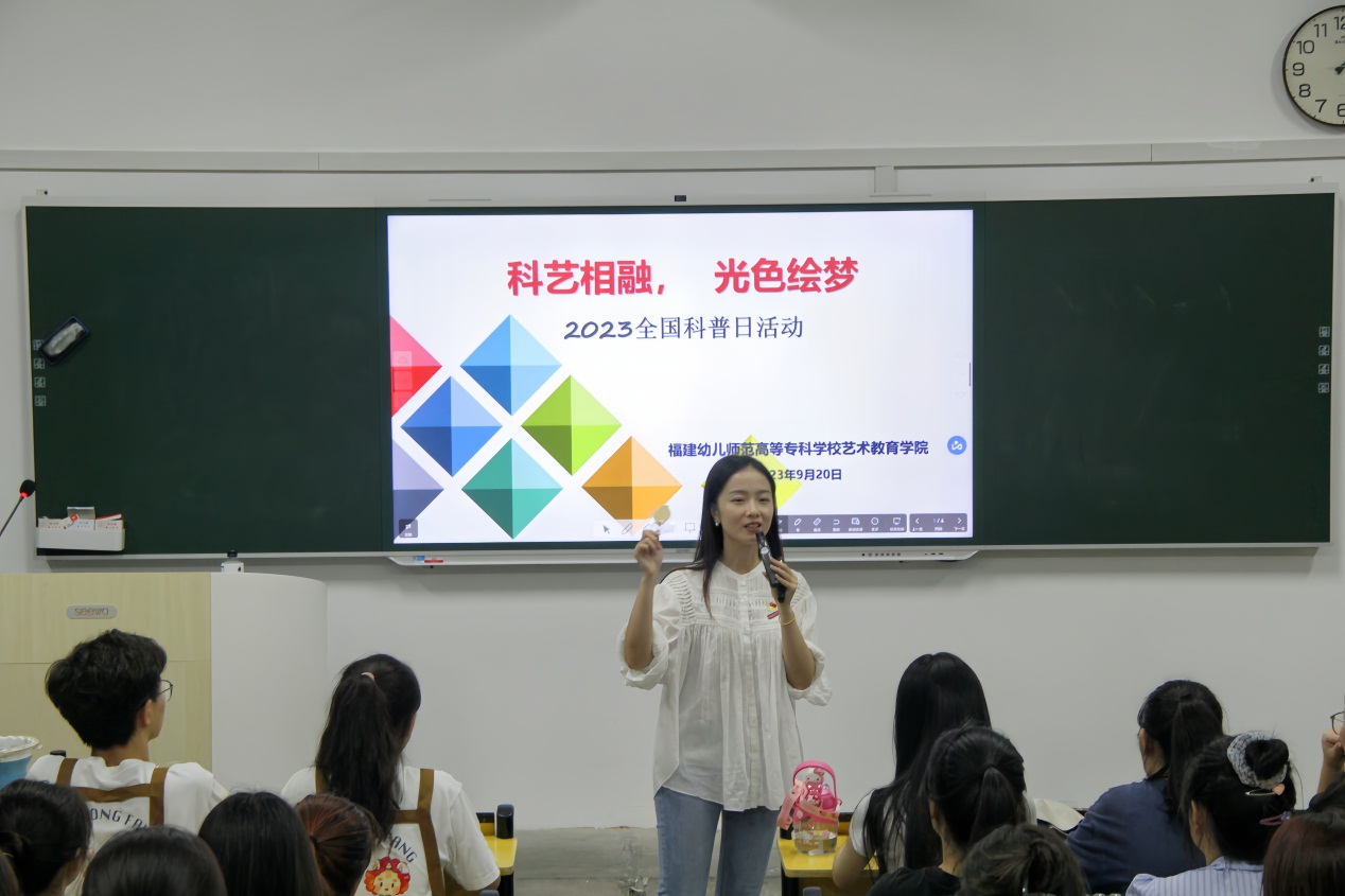 为全面落实党的二十大精神,深入宣传习近平总书记对科技创新和科学普及的战略擘画,贯彻《中国科协等21 部门关于举办2023 年全国科普日活动的通知》(科协发普字〔2023〕34 号)《福建幼儿师范高等专科学校关于开展2023 年"全国科普日"活动的通知》闽幼高专科(〔2023〕21号)要求,9月20日下午,艺术教育学院青年教师赵倩面向全校师生开展"科艺相融,光色绘梦"——2023 年福建幼儿师范高等专科学校"全国科普日"活动。活动由校科研处主办,艺术教育学院、艺术教育学院教工第二党支部、"艺术教育专业群"福建省教师教学创新团队兼合式党支部联合承办。活动围绕"提升全民科学素质,助力科技自立自强"主题,结合美术专业特点,强调在艺术学科中寻找科学元素,在艺术创作中学习科学知识,在"艺术+科学"的学科融合贯通中培养学生的审美能力、动手能力、思考能力和创新能力。