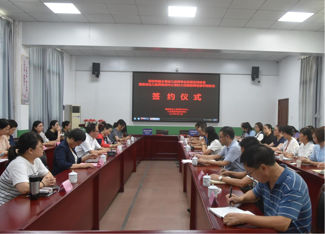 9月19日-24日,福建省2023年基础教育师资培训幼教教师培训下沉式项目大田班第一阶段培训暨"联动构建乡镇幼儿教师专业发展支持体系"研训活动在大田县正式启动,全县250名园长、教师参加培训。福建省幼儿教师培训中心与大田县教师进修学校签署"联动构建乡镇幼儿教师专业发展支持体系"帮扶协议。福建幼儿师范高等专科学校校长林伟川教授、教师教育发展学院院长薛少红、福建省幼儿教师培训中心主任彭琦凡教授、大田县人民政府副县长崔彦、大田县教育局党组书记涂建志、大田县教师进修学校校长林再生,以及省教育厅幼教"下沉式"培训专家团、大田县有关领导干部、园长出席签约仪式。