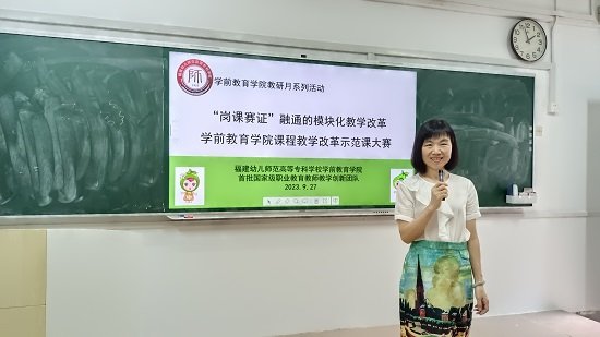 为进一步完善"岗课赛证"综合育人机制,推动模块化课程体系的重构与教学改革,促进教师、教材、教法"三教"改革的力度,全面提升课堂教学质量,学前教育学院以"岗课赛证"融通背景下模块化教学改革为主题开展系列教研活动。2023年9月27日下午,学前教育学院在仓山校区教学A楼205教室成功举办"岗课赛证"融通背景下模块化教学改革暨课程教学改革示范课说课大赛。学前学院全体教师参加本次活动。