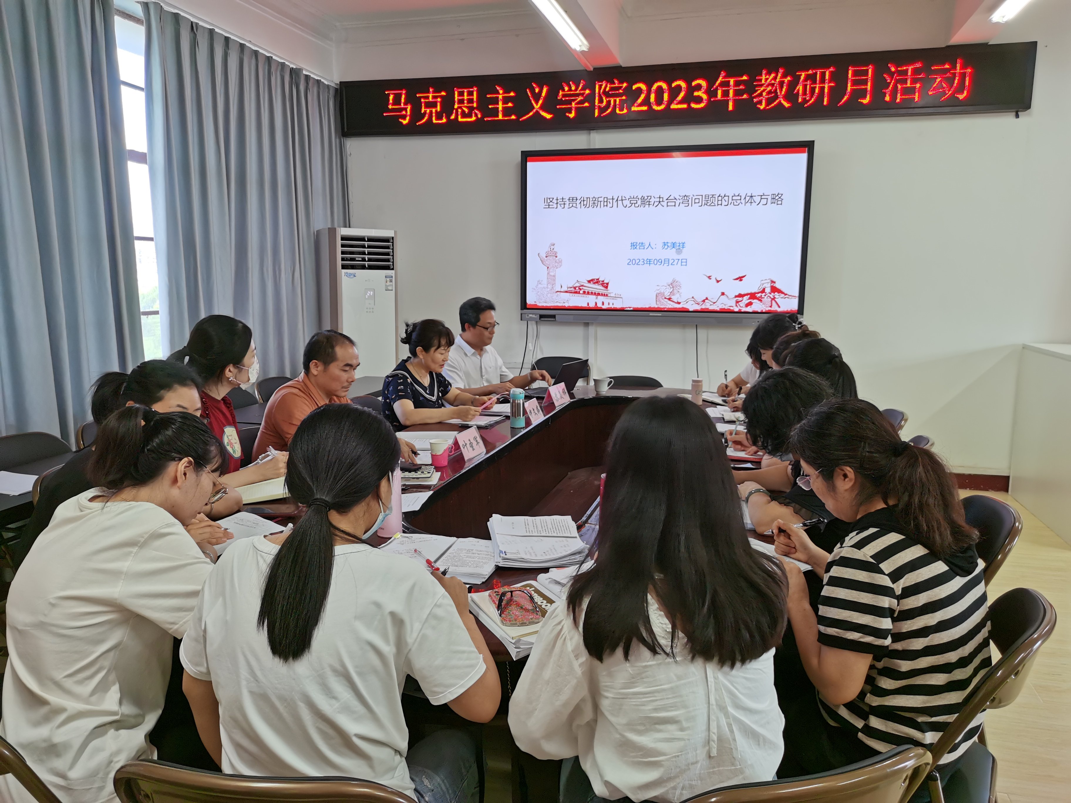 9月27日,马克思主义学院在院办601开展"形势与政策"课主题教研活动。本次活动邀请福建社会科学院现代台湾研究所所长苏美祥教授进行"坚持贯彻新时代党解决台湾问题的总体方略"专题剖析,教务处副处长叶圣军及马克思主义学院全体教师参加交流研讨。