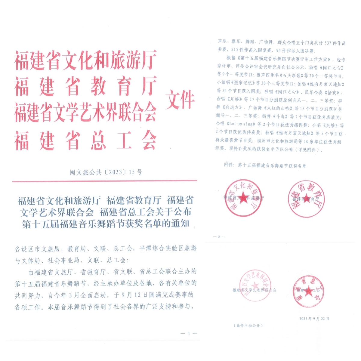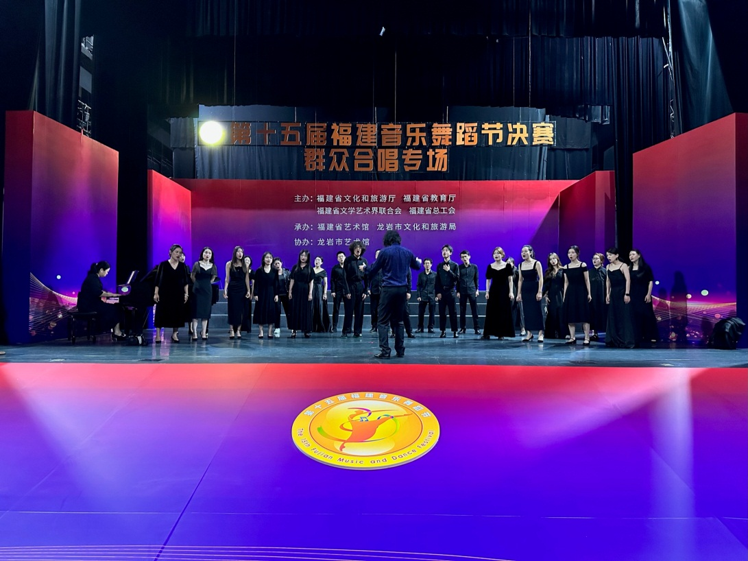 近期,福建省文旅厅、省教育厅、省文联、省总工会联合主办的第十五届福建音乐舞蹈节获奖结果公布。本届音乐舞蹈节分声乐、器乐、舞蹈、广场舞、群众合唱五个门类,共计537件作品参赛,215件作品入围复赛,95件作品入围决赛。经过激烈角逐,艺术教育学院艺术理论教研室陈语老师带领的福州吾乐室内合唱团荣获群众合唱比赛三项奖励。陈语老师个人荣获优秀指挥奖一等奖第一名,作曲的原创合唱作品《let us sing 一起唱吧》位列第三名,荣获原创音乐二等奖,合唱团获群众合唱成人组一等奖。