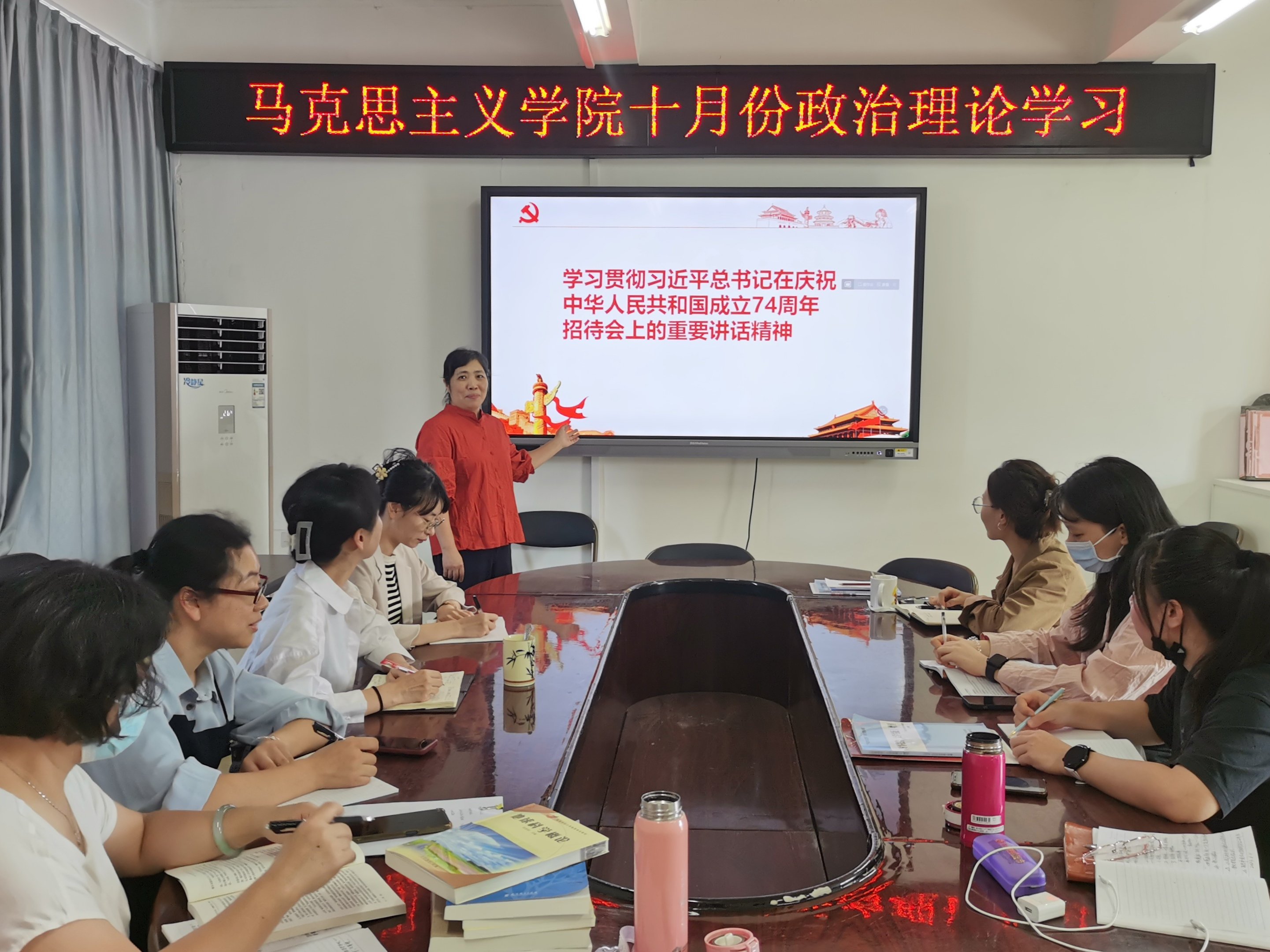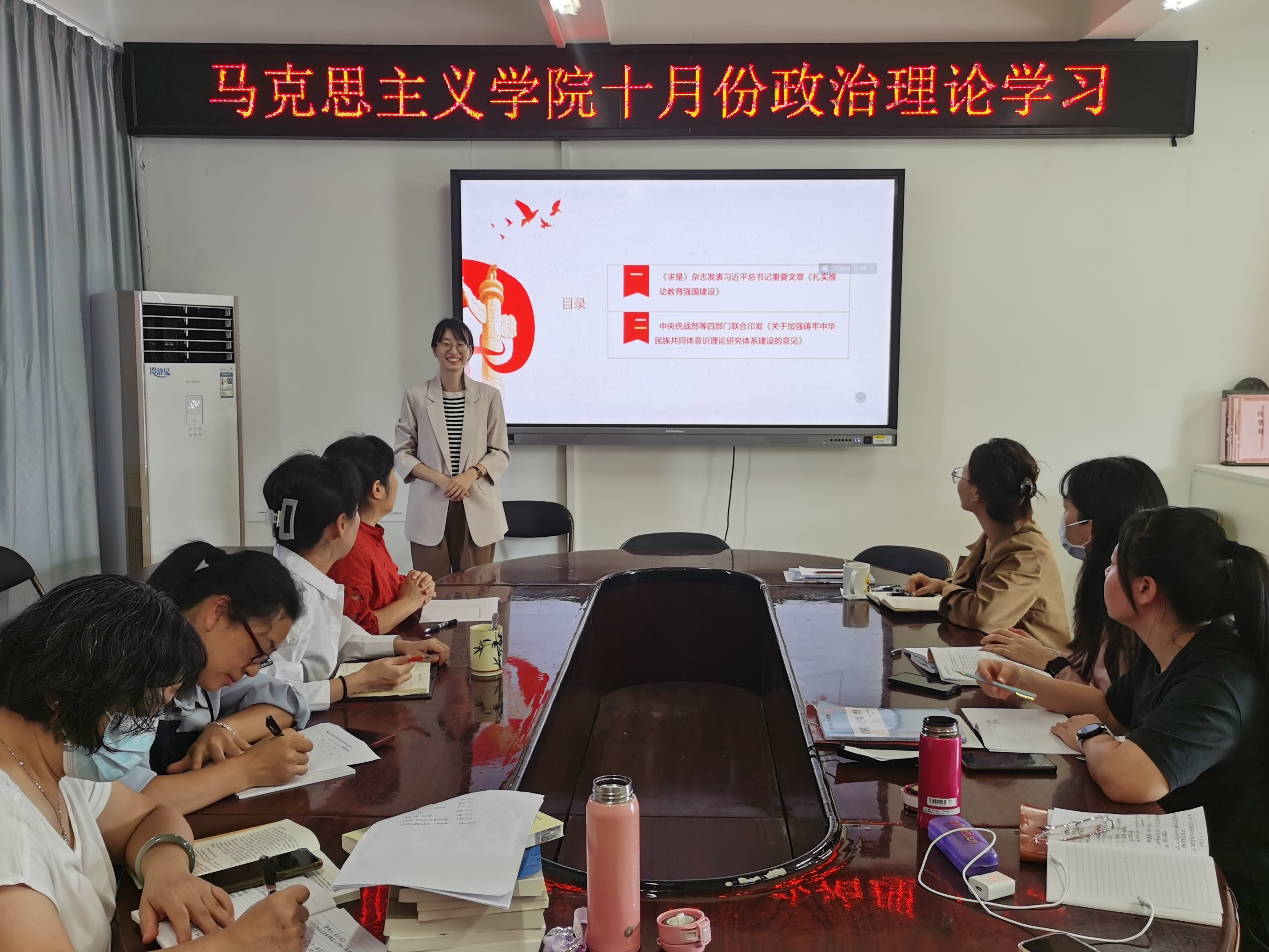 2023年10月18日下午,马克思主义学院于学院会议室开展十月政治理论学习。此次学习由党员教师郑丽萍、李缀领学。