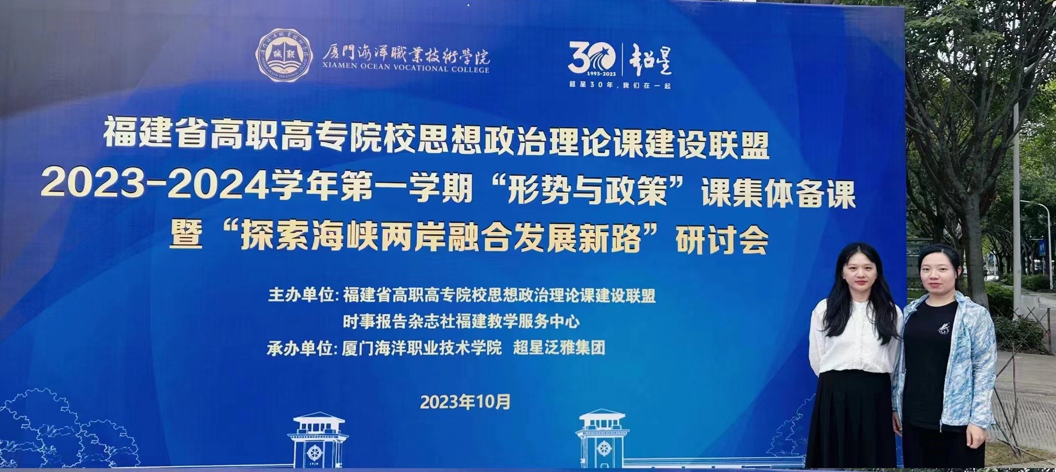 2023年10月28日,我校马克思主义学院高雯婷和方春兰老师参加2023-2024学年第一学期"形势与政策"课集体备课暨"探索海峡两岸融合发展新路"研讨会议。本次会议由全国高校思政课"手拉手"集体备课中心(福建师范大学)与福建省高职高专院校思想政治理论课建设联盟联合主办,厦门海洋职业技术学院承办。
