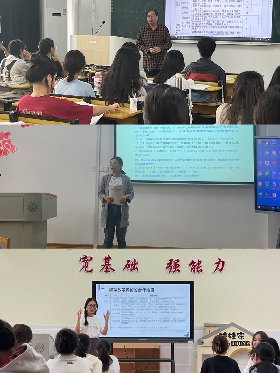 2023年10月23-25日,国家级创新团队成员、学前教育学院肖英娥副院长和创新团队成员王先达教授,带领学院青年教师王雨佳等分别在各自授课班级开展了《学前儿童身体保健教育的模拟教学》的公开课,国家级创新团队中的早教教研室主任楚艳民、特教教研室主任谢冰清和杨佳博士,联合婴幼儿托育与管理教研室、理论教研室、实践教研室等多名教师组成教研团队,共同观摩指导了本次课程组公开课展示。