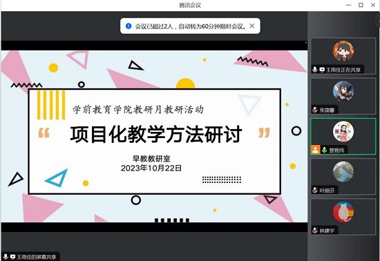 开课前,《学前儿童健康教育》课程集备组及早教教研室共同组织相关教师进行"项目化教学方法研讨会"。一方面,对本次公开课的教案设计及细节进行修改与调整,并且采用"同课异构"的方式,由多位承担该门课程的老师交流公开课实施方案,确保教学活动开展的有效性。另一方面,《学前儿童健康教育》课程的总体思政融入路径为结合健康中国理念,唤醒学前师范生的健康意识,重构健康行为,生成健康教育责任感。本次研讨会结合该门课程整体思政理念将本节公开课的思政落脚点最终敲定为"体验幼儿园教师实施身体保健教育活动的艰辛,增强学生对儿童身体健康的关注和热爱。"
