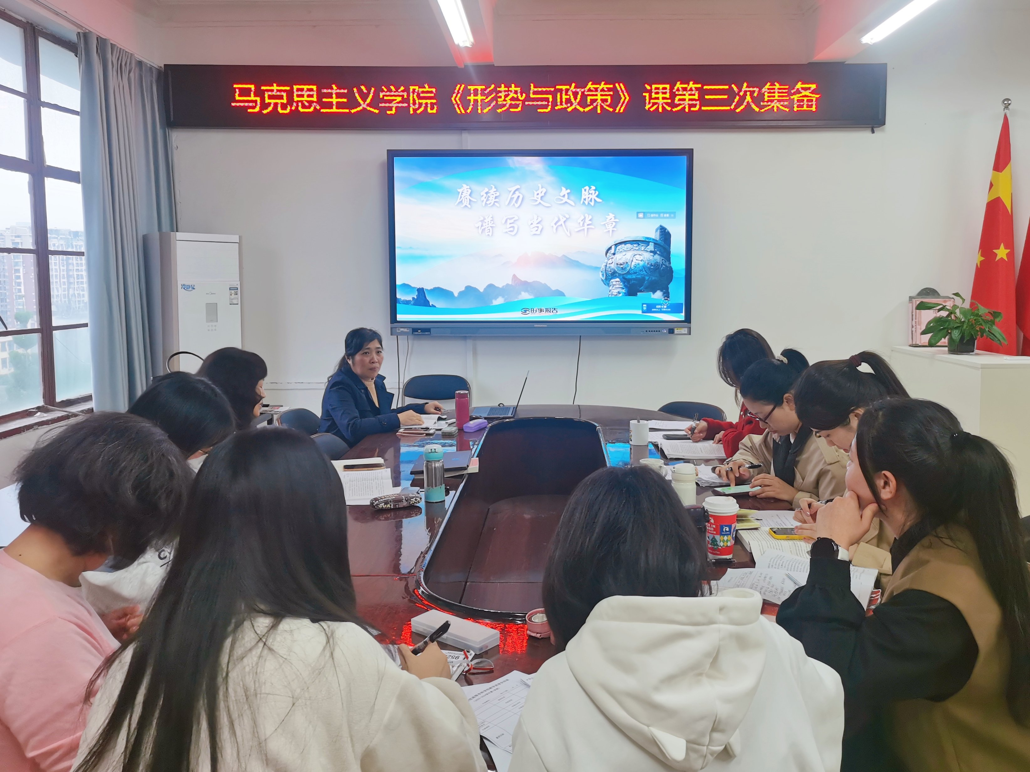 2023年11月15日下午,马克思主义学院于院办会议室开展《形势与政策》课第三次集体备课活动。此次集备由"思想道德与法治"课教研室主任郑丽萍主讲,马院全体教师参加。