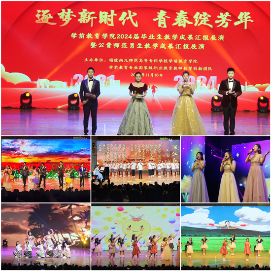 学前教育学院于2023年11月18日晚上19:00在白马校区礼堂举办学前教育学院2024届毕业生教学成果汇报展演暨公费师范男生教学成果汇报展演活动。校党委书记鲍仕梅、校长林伟川、学生工作部部长薛景、学前教育学院党总支书记王标、学前教育学院院长吴丽芳,以及各教研室主任、任课老师、辅导员老师们和全院21级967名学生一起观看了本场汇报展演。