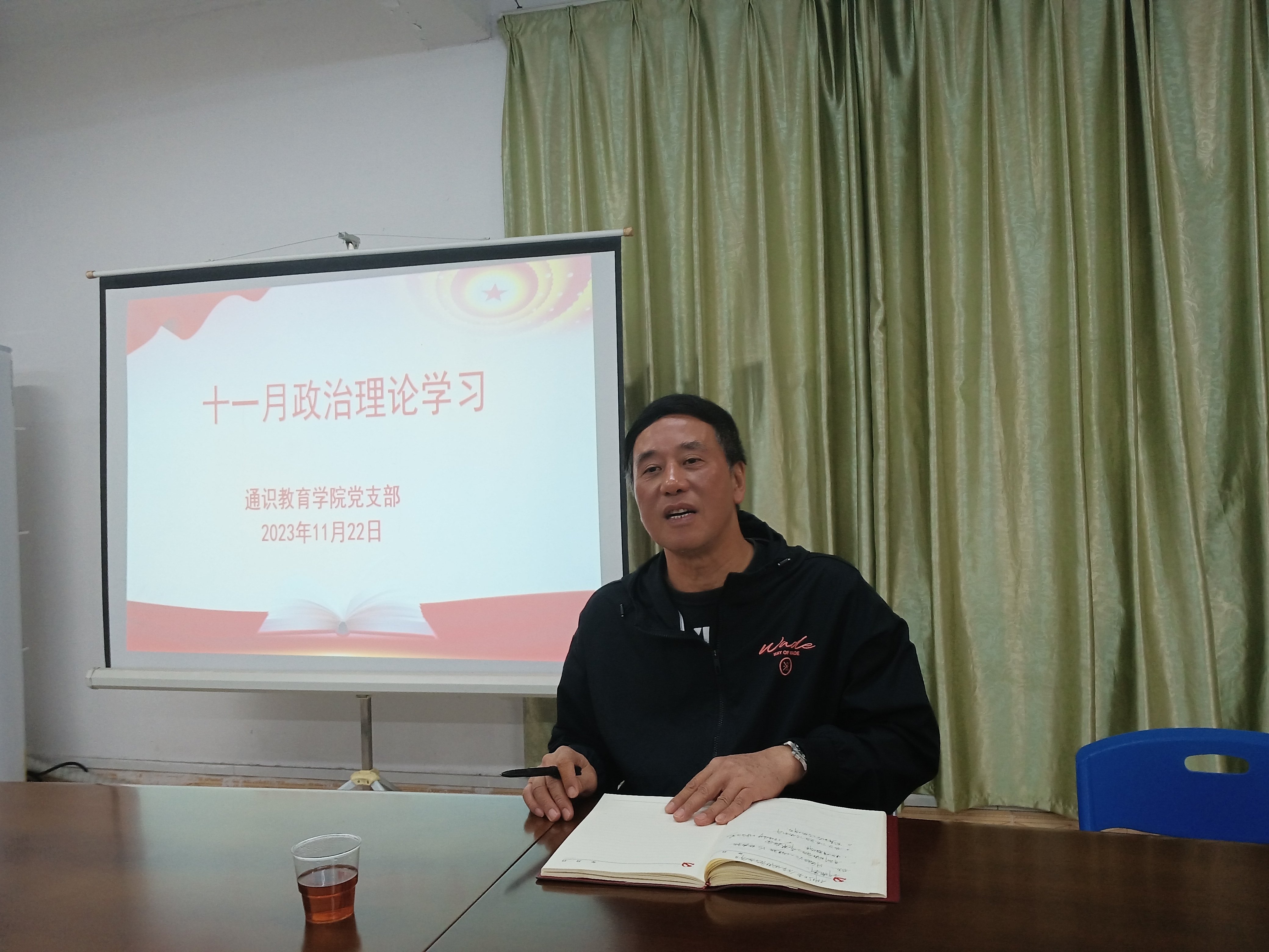 2023年11月22日,通识教育学院党支部在系部楼506会议室开展十一月份政治理论学习,会议由陈福榕书记主持并讲授,全体党员共同参与。