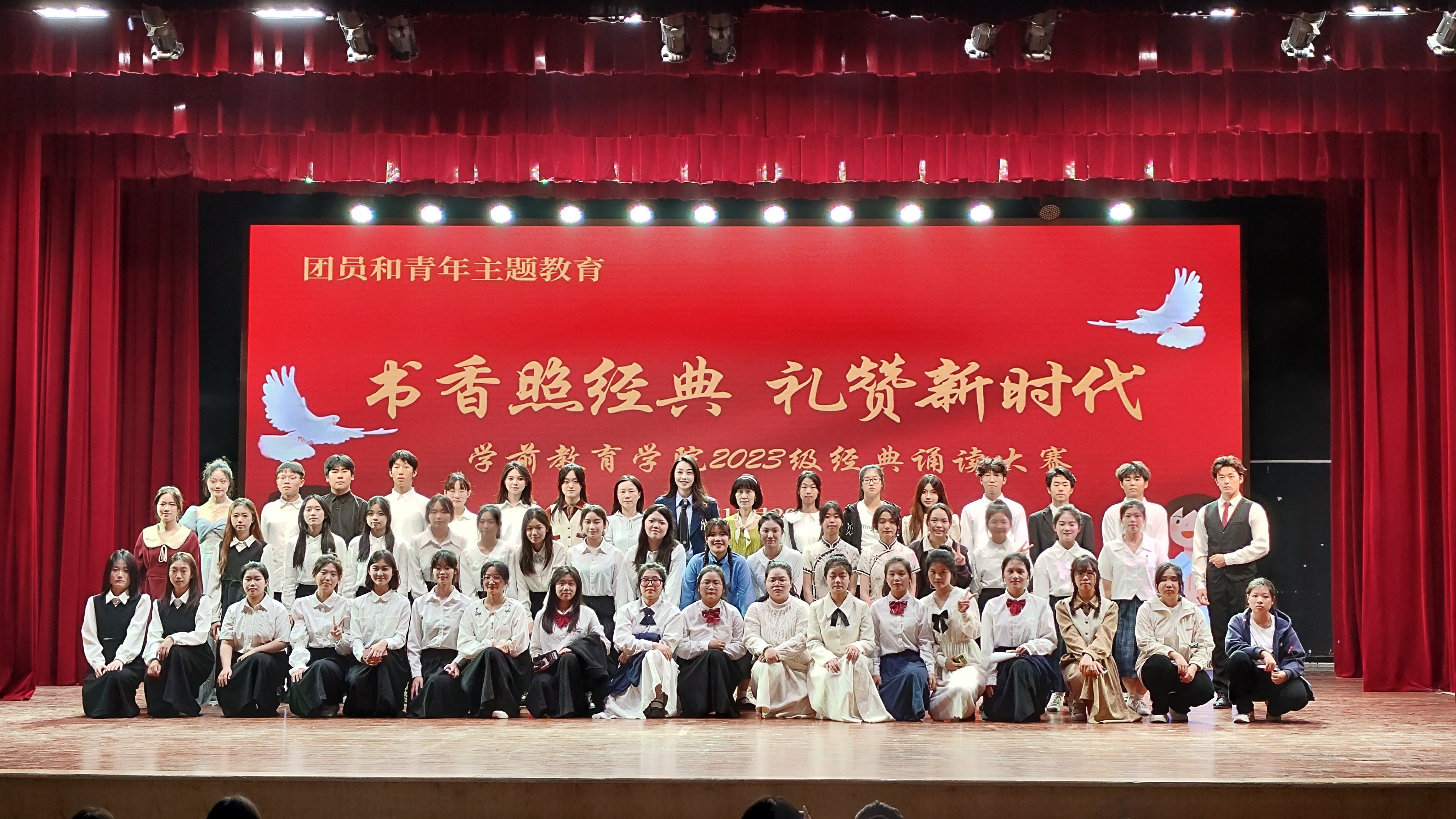 诗的语言,典藏着五千年悠久的历史文化,诗的声音,演绎着不朽历史的风骨铿锵。2023年11月29日晚,通识教育学院儿童语言艺术研究中心与学前教育学院联合举办的"书香照经典,礼赞新时代"学前教育学院2023级经典诵读大赛在我校礼堂如期开展。学前教育学院2023级18支代表队诵读了《不朽》《美丽中国》《我的南方和北方》《以梦为马》等作品,抒发了真挚的家国情怀,展现了青春的活力与激情。经过激烈角逐,特教2311班勇夺桂冠。本次活动不仅提升了学生们的语言基本功和语言文化素养,更激发对中华经典的热爱,增强学生的文化自信、价值认同和文化传播实践能力,营造了良好的书香校园氛围。