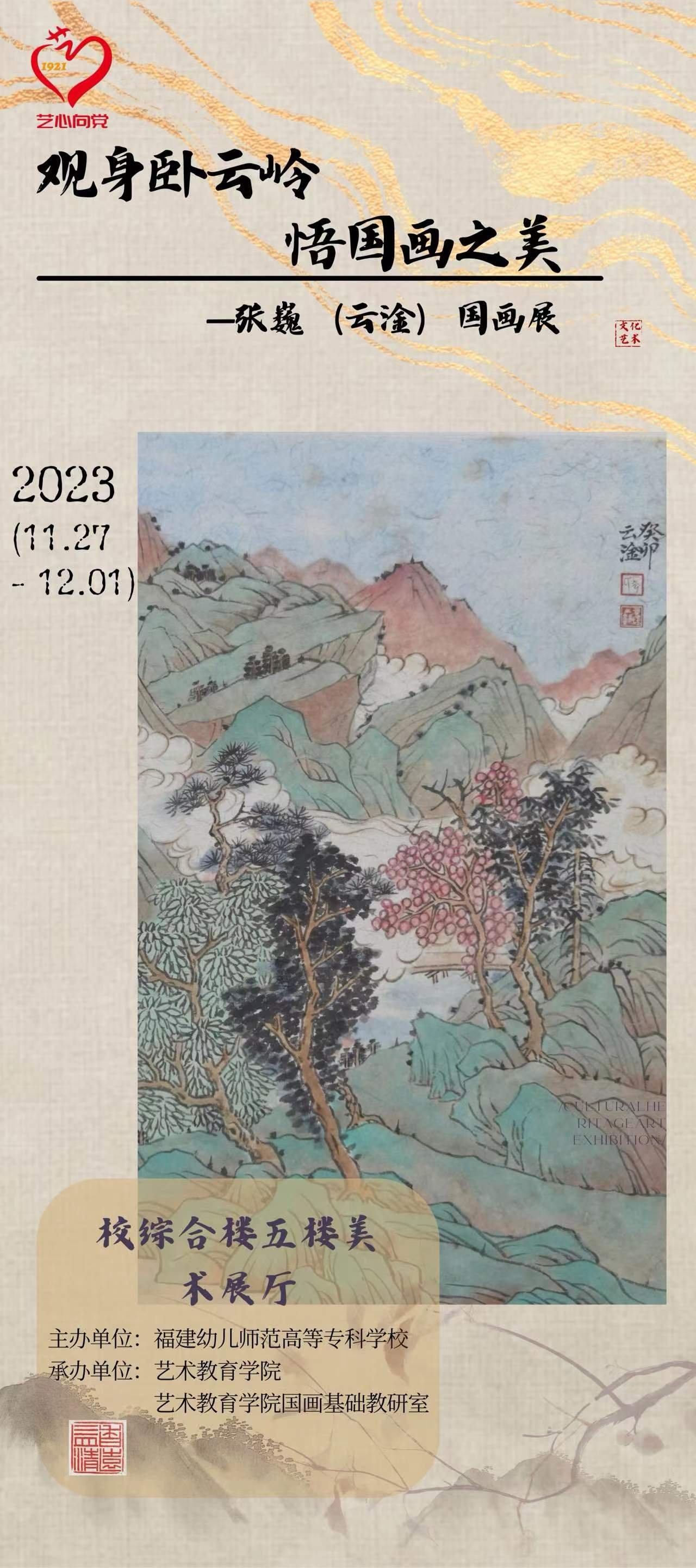 2023年11月27日至12月1日,"观身卧云岭 悟国画之美--张巍中国画展"在福建幼儿师范高等专科学校综合楼美术展厅举办。本次画展以"观身卧云岭 悟国画之美"为主题,展示了艺术教育学院国画基础教研室张巍副教授精心创作的四十八幅山水画和花鸟画作品,引导广大师生了解、感悟中国画,领略中国画的独特魅力和深厚内涵。我校林伟川校长、郑晓生副校长、谢福仁副校长等领导莅临现场指导,各学院、各部门教师、学生们纷纷前往展厅观展。