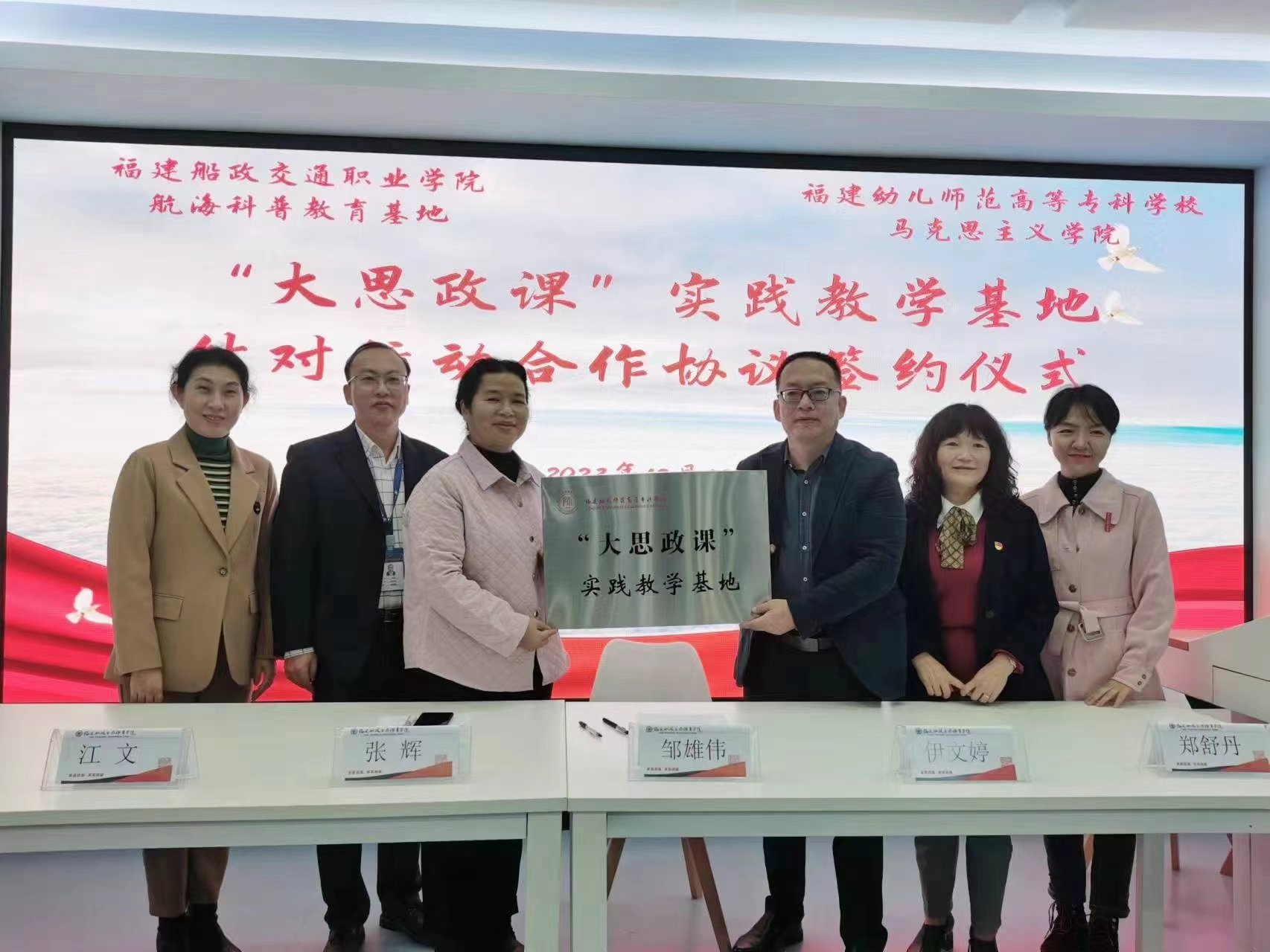 福建幼儿师范高等专科学校校党委副书记邹雄伟,福建船政交通职业学院党委委员、纪委书记张辉分别代表双方签订"大思政课"实践教学基地共建协议、并共同为"福建幼儿师范高等专科学校'大思政课'实践教学基地"揭牌。