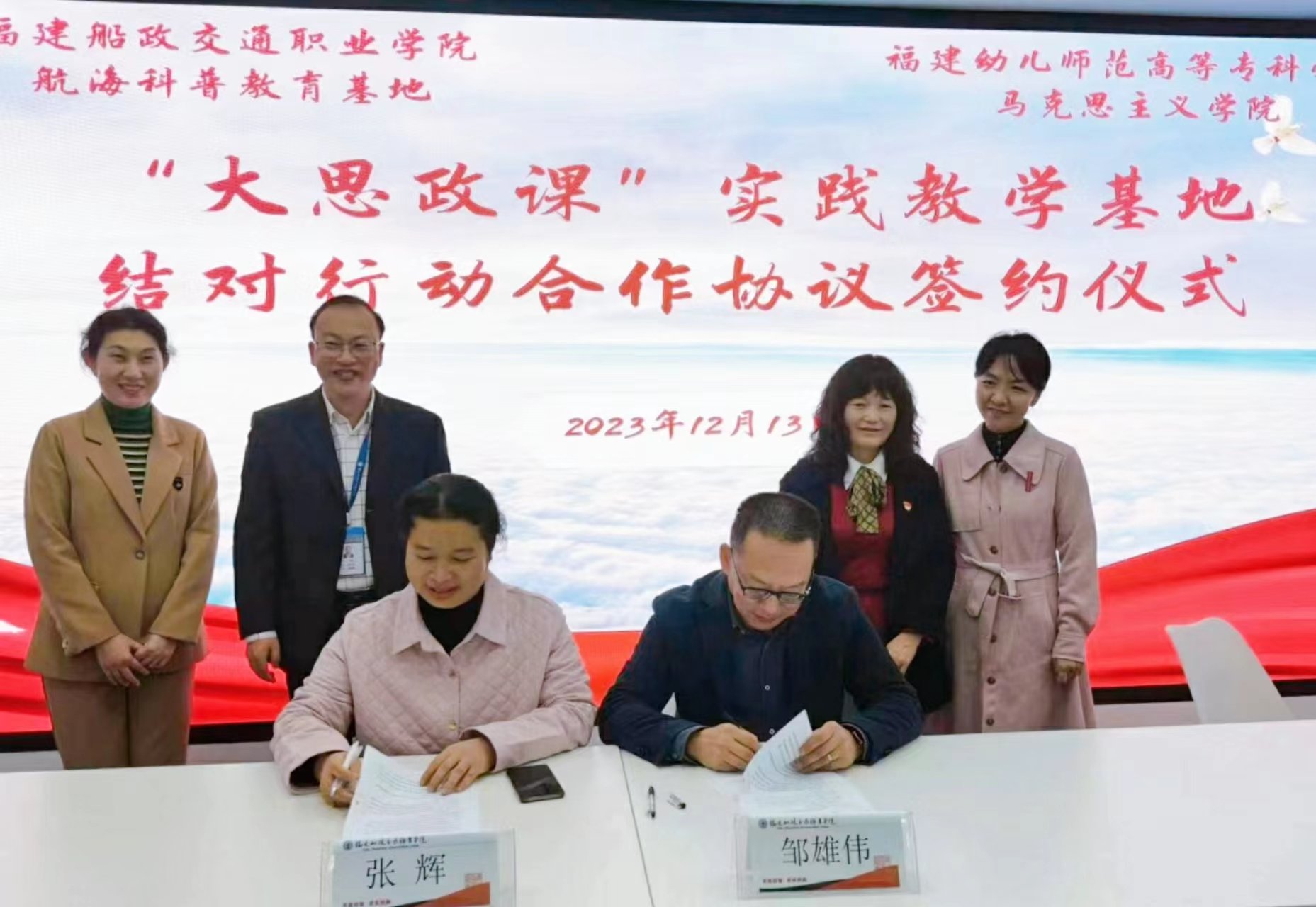 12月13日,福建幼儿师范高等专科学校与福建船政交通职业学院共建"大思政课"实践教学签约暨揭牌仪式在福建船政航海科普教育基地举行。参加仪式的有福建幼儿师范高等专科学校校党委副书记邹雄伟,福建船政交通职业学院党委委员、纪委书记张辉,福建船政交通职业学院航海学院党总支书记江文,两校马克思主义学院教师及我校习近平新时代中国特色社会主义思想读书社共40余人。