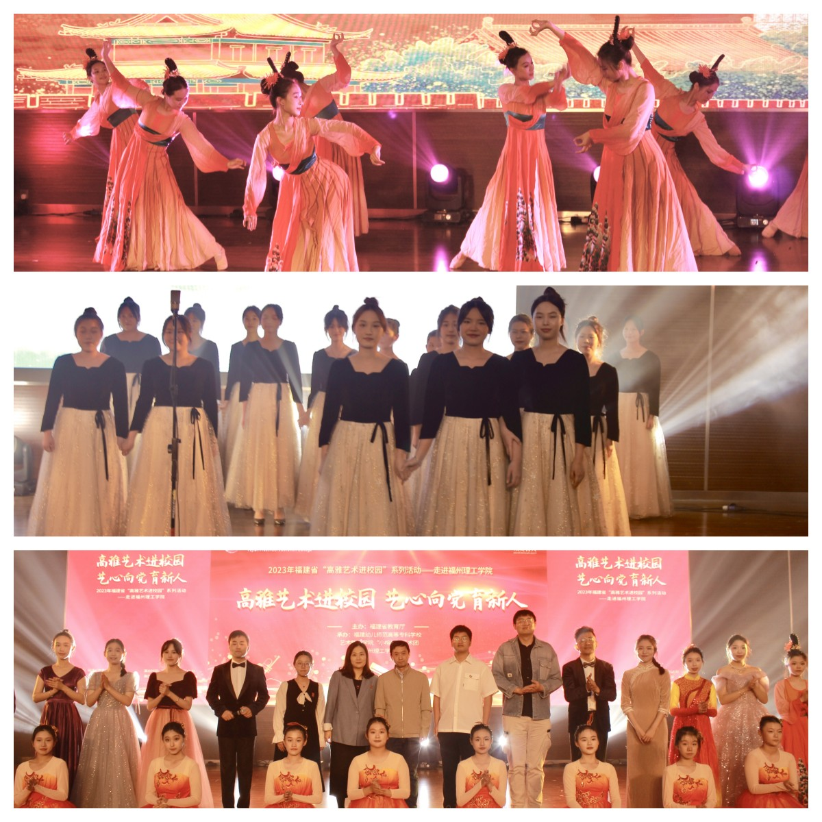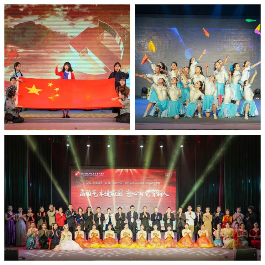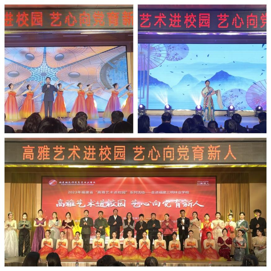 为深入学习贯彻党的二十大精神和党的教育方针,落实中共中央办公厅 国务院办公厅《关于全面加强和改进新时代学校美育工作的意见》和我省实施方案,进一步加强和改进学校美育工作,提高学生审美和人文素养。2023年11月,以"高雅艺术进校园 艺心向党育新人"为主题的演出在福州理工学院、泉州华光职业学院、三明学院、三明林业学校、福建林业职业技术学院举办。出席各场次演出的领导有福建省教育厅体育卫生艺术教育与语言文字处处长苏贻堆,福建幼儿师范高等专科学校党委副书记、校长林伟川;福建林业职业技术学院党委书记万泉,院党委副书记、院长刘文开,党委副书记严绍裕,副院长李肇锋,组织部(统战部)部长李霞;泉州华光职业学院董事长吴其萃、校长陈雅芳,党委书记吕红军;三明学院宣传部部长钟艳,三明林业学校陈基传副校长、赖晓红副校长、曾文水副校长;福州理工学院团委书记陈晶,以及我校和各承演学校师生代表7000余人观看精彩演出。