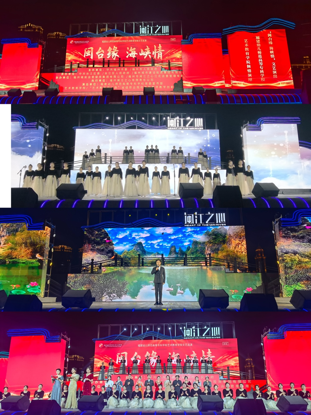 9日至10日,"闽台缘 海峡情"文艺巡演在闽江之心海丝广场举办,我院"艺术教育专业群"省级职业院校首批教师教学创新团队、兼合式党支部,王萍萍教授工作团队携手"学前教育专业"首批国家级职业教育教师教学创新团队倾情演绎,师生们献上两场精彩的文艺演出。演出走进社区,贴近群众,通过丰富多彩的艺术形式,带领来自八方的朋友们领略高雅艺术之美,充分展现了我校致力于传承弘扬中华优秀传统文化、革命文化、社会主义先进文化,积极服务社会、热心公益活动的成效。