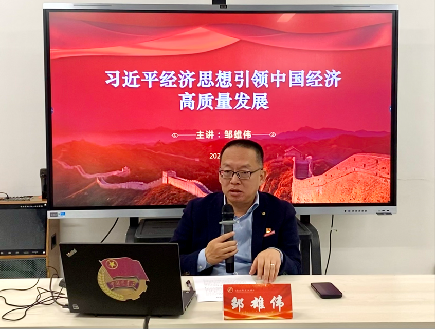 邹雄伟副书记从深刻领会习近平经济思想切入,在"两个根本"、"领悟三新一高"、"掌握五大抓手"、"树立两大思维"四个方面对习近平经济思想的基本内容进行了深入浅出的讲解和分析。通过一系列详实的论证和数据支撑,明确党的十八大以来,在习近平经济思想指引下,我国经济社会发展取得历史性成就,发生历史性变革;明确现今我国的经济有明显回升并体现出良好的增长态势,具体表现为经济增速含金量高、消费能力整体恢复向好、投资保持平稳增长、出口增势高于预期、物价保持平稳运行、就业形势总体改善。他要求青年学生不仅要看准当前的"形",更要把握长远的"势",不为一时的波动起伏所惑所惧;坚信我国必将实现经济运行持续好转,内生动力持续增强,社会预期持续改善,风险隐患持续化解;鼓励广大学子坚定理想信念,脚踏实地,学习本领。