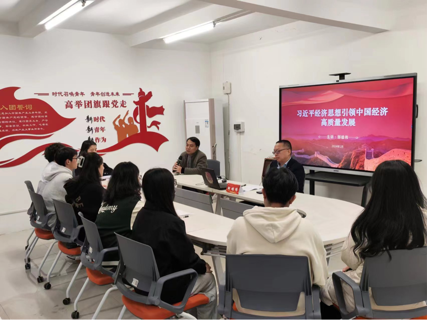 2024年1月10日下午,校党委副书记邹雄伟为我校青马班学生讲授题为"习近平经济思想引领中国经济高质量发展"的形势与政策课。