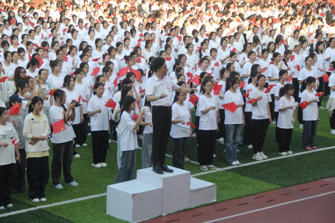 《歌唱祖国》的尾音仍在操场上空回荡,一声铿锵的指令骤然响起:“传递国旗!”刹那间,十余名国旗班成员双臂高擎着那面巨幅五星红旗,仿佛托起一片奔腾的血色海洋,旗面在风中猎猎翻卷,从操场侧边向着主席台奔涌而去。当五星红旗在主席台前豁然展开,全体师生手握小红旗挥舞,整个操场化作一片星火的海洋,晨光在旗面的经纬线上跳跃,犹如银河倾泻而下,台下全体师生肃立的身影,恰似守护这片红色的星辰。