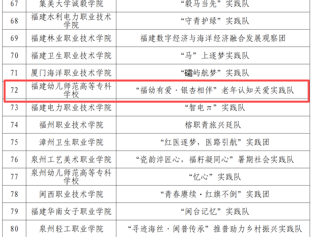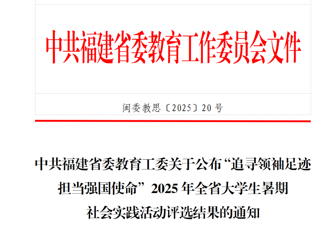 近日,“追寻领袖足迹 担当强国使命”2025年全省大学生暑期社会实践活动评选落下帷幕。该活动由中共福建省委教育工委主办,经高校推荐、专家评审、网上公示等严格评选程序,我校“福幼有爱·银杏相伴”老年认知关爱实践队获评省级“优秀实践团队”,福建幼儿师范高等专科学校获评“优秀组织单位”。