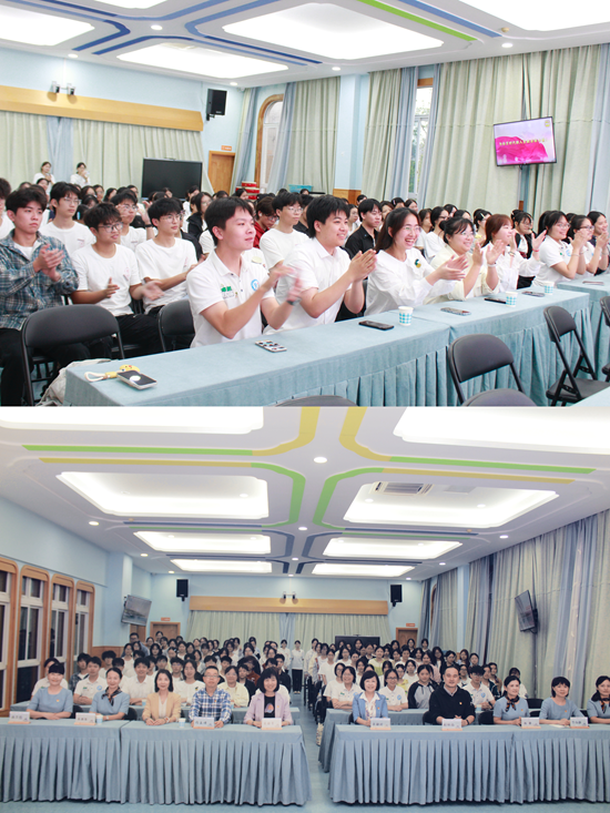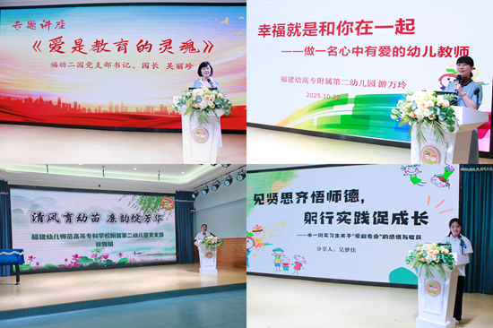 之后,老中青四代福幼人为大家带来精彩的分享。福建省杰出人民教师吴丽珍先以《爱是教育的灵魂》为题开始了专题讲座,讲座围绕“百十育爱,薪火相传”的主题,结合福建幼儿师范高等专科学校校园协同育人的百年坚守的历史脉络,从爱幼教、爱孩子和爱工作方面给未来幼教人进行“爱”的教育启蒙,既让每个幼儿成为爱的种子,又让学前教育高本贯通班的孩子成为播撒爱的种子的新时代优秀幼儿园教师。接着,我校中青年骨干游万玲老师和年轻新秀徐雅娟老师分别以《幸福就是和你在一起--做一名心中有爱的幼儿教师》及《清风育幼苗,廉韵绽芳华》为题,让大家切身感受百年幼师的深厚底蕴与附属二园“以爱育爱”的办园实践,给予新生“爱”和“责任”的教育。然后国家奖学金获得者学前教育专业2023级优师班学生代表吴梦佳学姐围绕“爱和专业”的感悟与收获,以《见贤思齐悟师德,躬行实践促成长》为题进行了专题分享,引导未来教师坚定从教信念、躬耕专业实践,筑牢学前教育高本贯通班学生的思想根基。