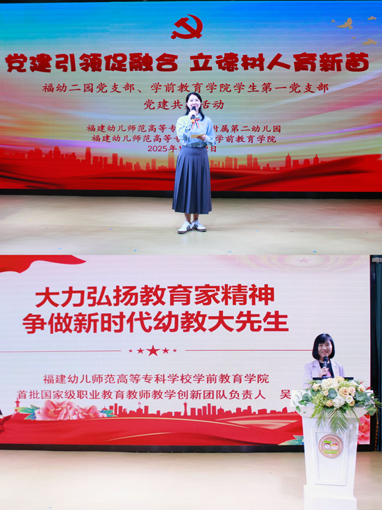 2025年10月22日,福建幼高专附属二园党支部和学前教育学院学生第一党支部举行了党建联建共建活动,此次共建旨在通过党建引领,深化合作,传承创新,结对帮扶,薪火童行,以爱育爱,促进校园深度合作,实现理论与实践的有机融合,弘扬“教育家精神”,引导未来教师们坚定从教信念,涵养道德情操,落实立德树人根本任务,为培育能够担当民族复兴大任的时代新人打下坚实基础。