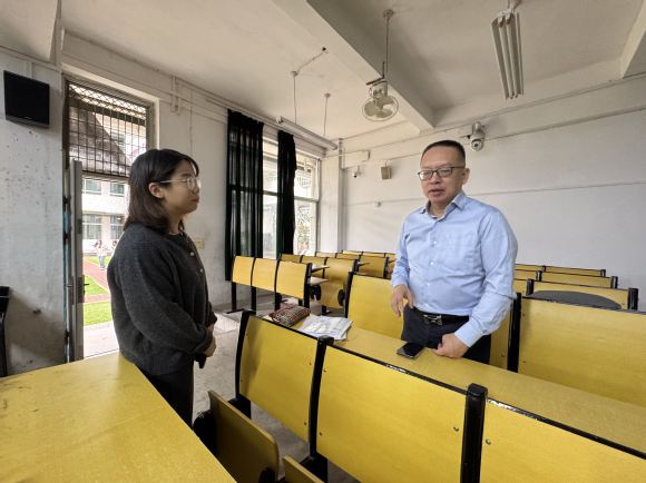 2025年11月7日上午,校党委副书记邹雄伟在马克思主义学院院长伊文婷等陪同下深入课堂一线,在仓山教学楼A105教室听取了马克思主义学院教师陈清清为人文科学学院小学教育2471班讲授的《形势与政策》课程。