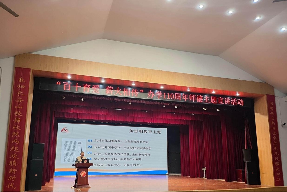 为深化师德师风建设,传承先辈教育工作者的崇高精神与育人初心,11月12日下午,我校在仓山校区礼堂举行“百十育爱 薪火相传”办学110周年师德主题宣讲活动,全体教职工共同聆听了学校质量监控与评估中心主任陈忠辉教授作的《黄世明大先生——从福州协和幼稚师范到中国幼教本土化的实践者》专题讲座。