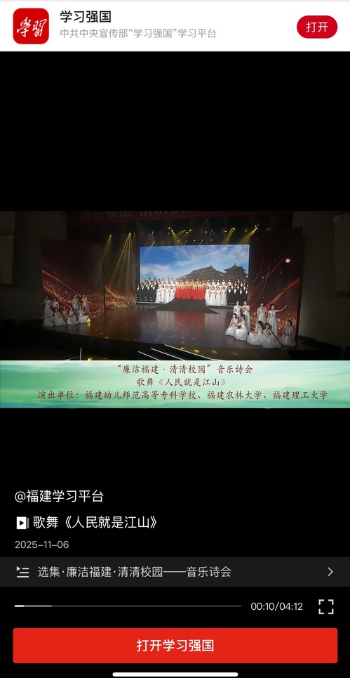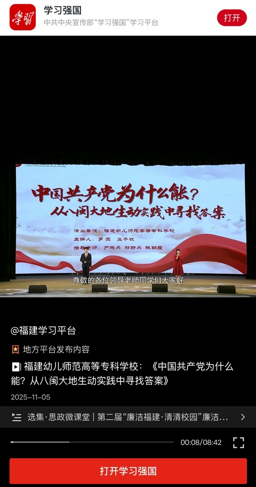 11月以来,学习强国平台相继报道我校参加第二届“廉洁福建·清清校园”廉洁文化周活动作品:“青廉说”思政大课堂思政微课《中国共产党为什么能?从八闽大地生动实践中寻找答案》、音乐诗会歌舞《人民就是江山》。