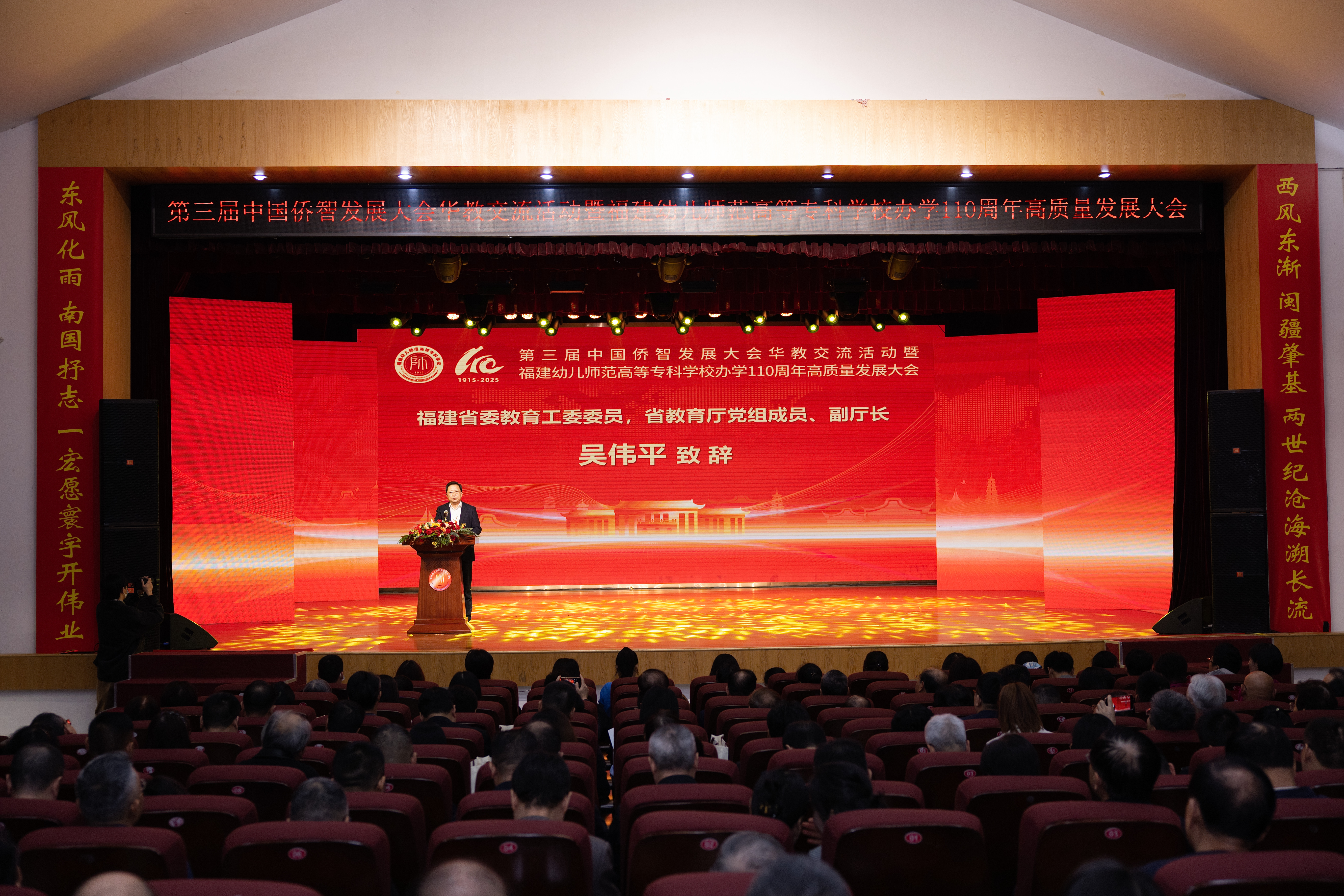 2025年12月2日,第三届中国侨智发展大会华教交流活动暨福建幼儿师范高等专科学校办学110周年高质量发展大会在我校仓山校区隆重举行。大会以“百十育爱,薪火相传”为主题,通过专题展演、校友互动、华教对话与战略签约等系列活动,全面展现学校百十年办学积淀与新时代使命担当。