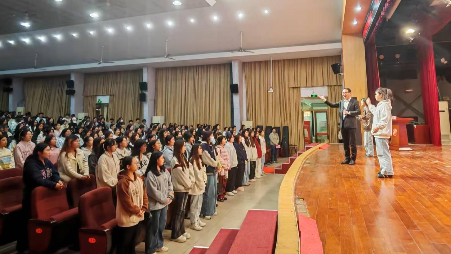 宣讲临近尾声,氛围被推向高潮。李刚教授亲自指导两个幸运观众指挥,带领全体师生起立齐唱《歌唱祖国》。熟悉的旋律与此次宣讲传递的民族自信形成遥相呼应,全场氛围庄重而热烈,不少师生热泪盈眶,实现了情感与精神的深度共鸣。