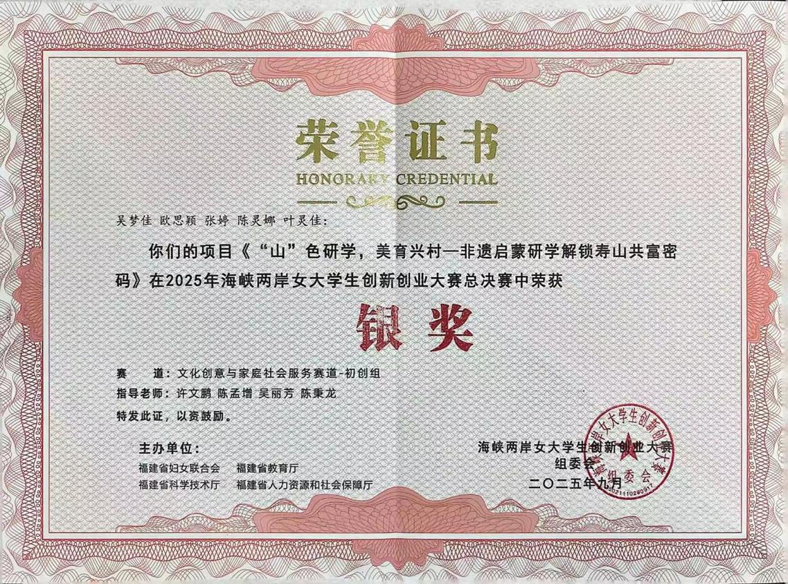 近日,2025年海峡两岸女大学生创新创业大赛总决赛顺利举行。本次大赛由福建省妇女联合会、福建省教育厅、福建省人力资源和社会保障厅、福建省科学技术厅联合主办。我校学前教育学院许文鹏、陈孟增、吴丽芳、陈秉龙四位教师共同指导的项目《“山”色研学,美育兴村——非遗启蒙研学解锁寿山共富密码》表现突出,荣获大赛银奖。