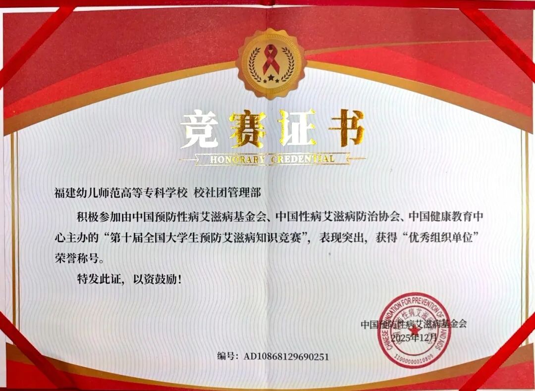 第十届全国大学生预防艾滋病知识竞赛结果公布,我校社团管理部凭借全校师生的热忱参与与扎实高效的宣传组织,在第十届全国大学生预防艾滋病知识竞赛中荣膺“优秀组织单位”!这不仅是对我校防艾工作的官方认可,更是对全校师生社会责任与公益精神的高度褒扬。
