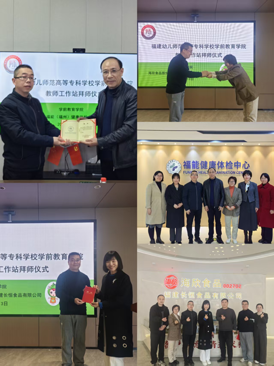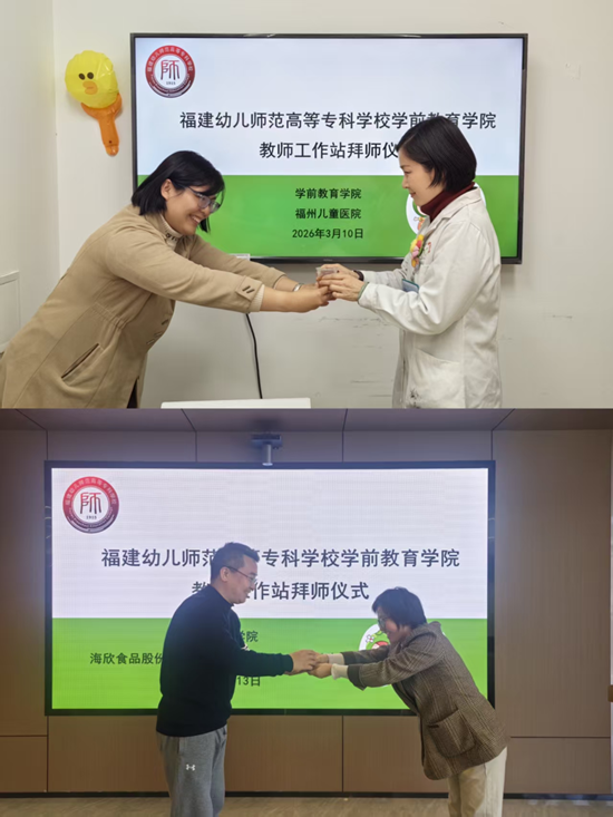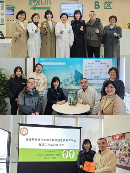 为积极响应《教育部关于深化职业教育教学关键要素改革的意见》《关于全面推进健康学校建设的指导意见》等文件精神,助力省级高水平专业群建设,2026年3月10日-13日,学前教育学院院长吴丽芳教授,学院副书记陈孟增,带领骨干教师杨佳、王雪梅等分别前往浙江诺特健康科技股份有限公司(福州分公司)、福州儿童医院、海欣食品股份有限公司、福能体验中心等多家单位,举行了教师工作站拜师仪式。