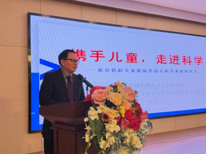 下午的论坛由福建省教育电视台王奇凡编导主持。首先,福建幼儿师范高等专科学校校长林伟川教授带来《携手儿童,走进科学》的学术报告,他从公民科学素质层面切入,全面探讨幼儿科学素养的培养模式,以优秀幼儿园科学素养活动为例,为共同推动家园科学教育的共育提供了新思路。接着,“福建省学前儿童家长科学育儿能力提升实践”项目组负责人程英教授,作了题为《家园共育的现状与提升策略——基于64700位家长的调查》的学术报告。程教授基于全省调研的大数据,剖析了当前福建省家园共育现状、家长育儿胜任感水平以及教师共育工作效能及其倦怠状况,并有针对性地从优化家园共育顶层规划、开创家园共育全新模式、强化教师在家园共育中的专业能力、增进各方情感关怀等方面,提出了详实而具有实操价值的实施建议。