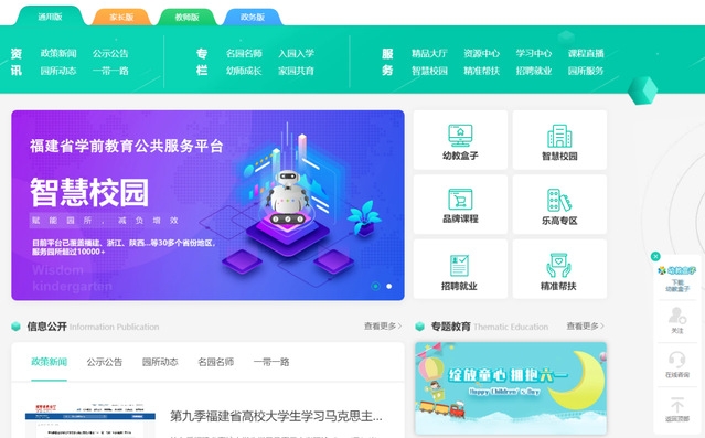 工程中心搭建的集资源、应用、培训、体验和教学于一体,立足福建、服务全国、辐射海外的多功能培养培训、资源共享和产品研发平台——福建省学前教育公共服务平台(www.fjxq.edu.cn),通过教育部备案,平台以服务我省学前教育高水平发展为目标,最大化发挥信息技术的作用,秉承“设计有价值、建设有质量、实施有保障、应用有前景”的理念,致力于科技赋能学前教育。项目还获得教育部公布的《高等职业教育创新发展行动计划(2015-2018年)》项目认定结果(教职成函[2019]10号文)。