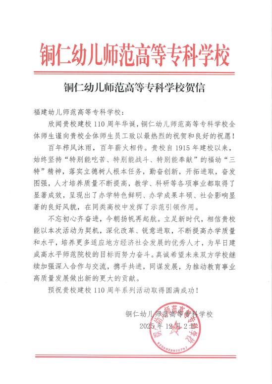铜仁幼儿师范高等专科学校贺信.