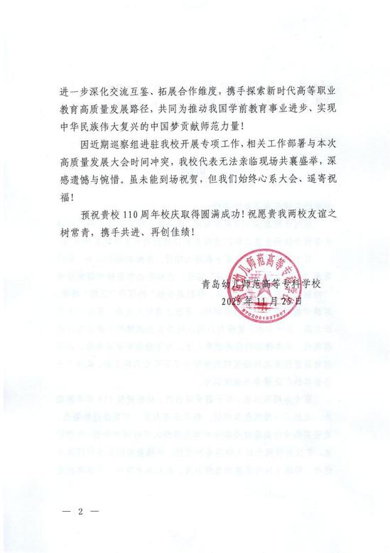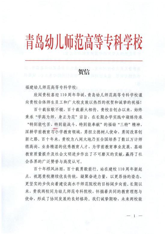 青岛幼儿师范高等专科学校贺信