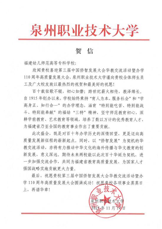 泉州职业技术大学贺信