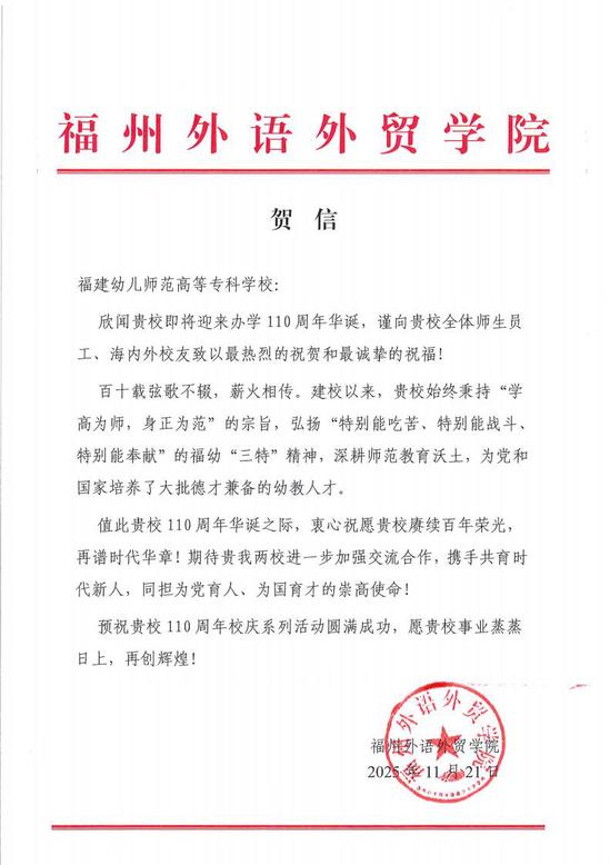 福州外语外贸学院贺信