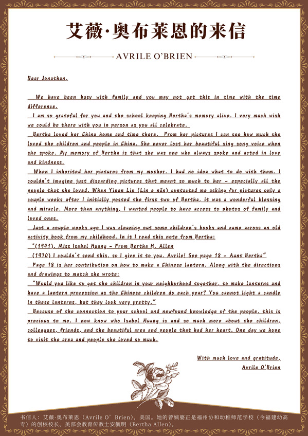 因为这份笔记与你们的学校有关,也让我对那里的人们有了新的了解,所以它对我来说弥足珍贵。我现在知道伊莎贝尔·黄是谁,也更加了解那些(伯莎的)孩子、同事、朋友,以及她深爱的这片美丽的土地和那里的人们。我们希望,有一天能去拜访她如此深爱的地方,和那里的人们。