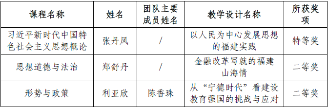 近日,福建省教育厅关于公布全省思政课教师“大练兵”交流展示活动评选结果。我校荣获高职组特等奖1项和二等奖2项,其中张丹凤老师的《以人民为中心发展思想的福建实践》教学设计获得特等奖;郑舒丹老师的《金融改革写就的福建山海情》教学设计和利亚欣、陈香珠两位教师的《从“宁德时代”看建设教育强国的挑战与应对》教学设计均获得二等奖。具体如下: