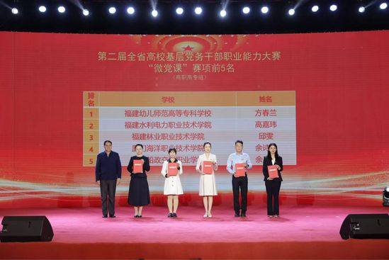 11月27日至28日,第二届全省高校基层党务干部职业能力大赛在福建师范大学举行。大赛设置知识测试、主题党日策划、微党课、谈心谈话4个竞赛环节,我校许冰灵、张育叶、方春兰三位老师组成的团队,在全省40余所高职院校的激烈比拼中发挥出色,荣获团体三等奖(全省高职高专组第六名),并在单项赛中取得突破:“微党课”赛项荣获全省高职高专组第一名,“知识测试”赛项获第六名。