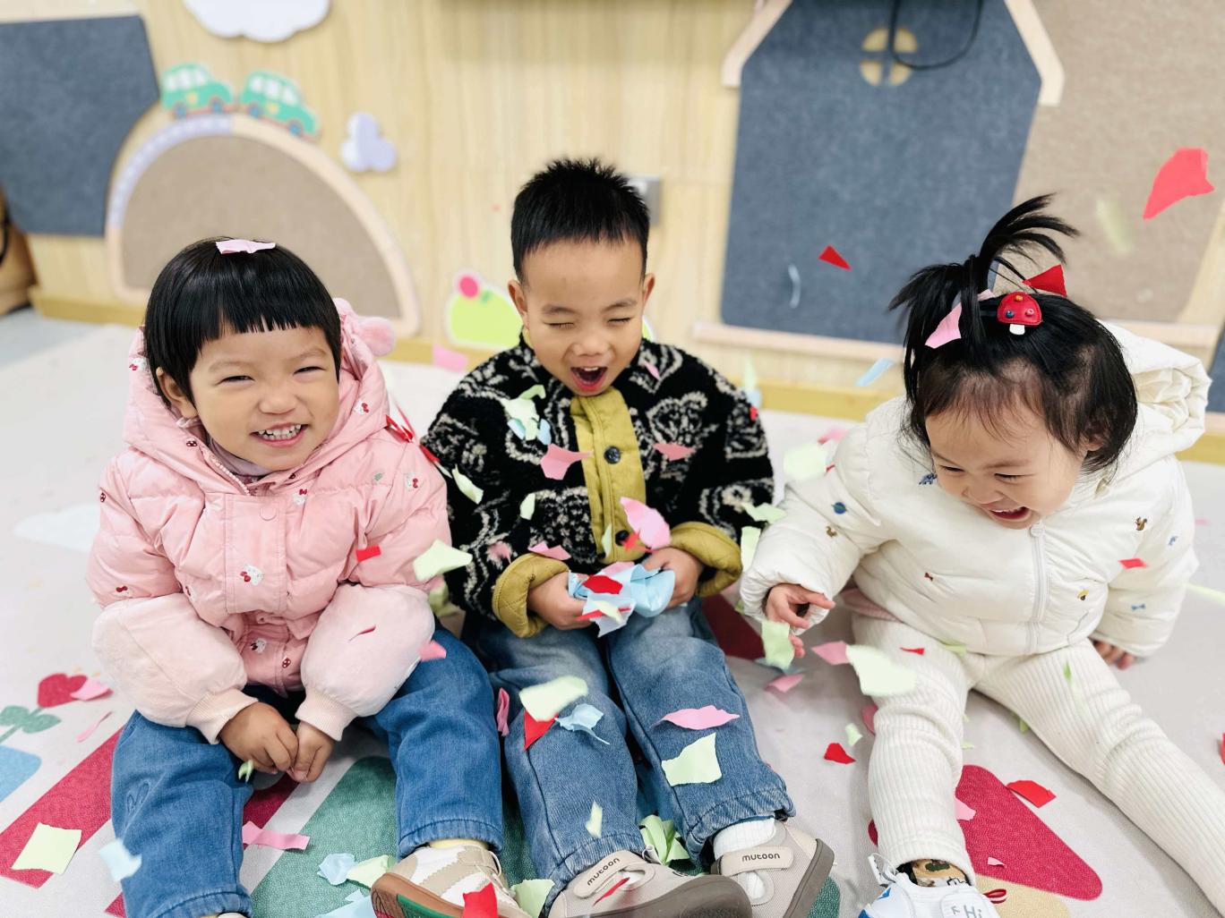 撕一撕,纸条碎成了轻盈的小雪花,撒向空中,“哗啦啦”下雪啦!碎纸落在头发上、肩膀上,笑声和“雪花”一起飞,生活里满是甜甜的冬日氛围!
