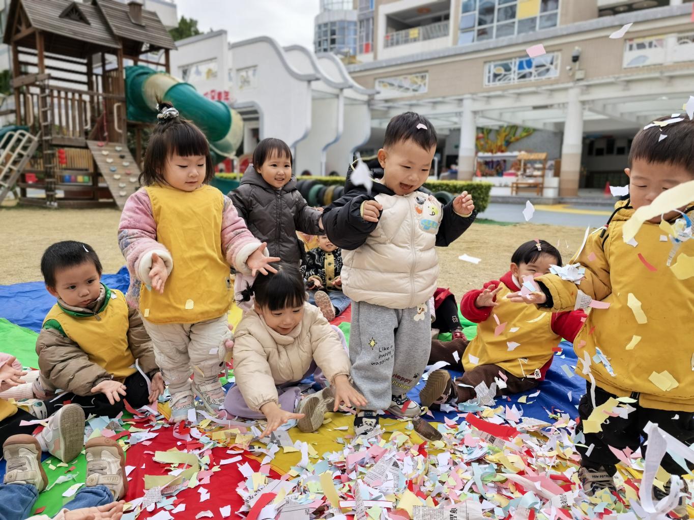 户外地垫上,摆满花花绿绿的纸片,小手轻轻揉一揉,“沙沙沙”,用力搓一搓,“哗啦哗啦”,纸片和笑声缠缠绵绵,声音派对开始啦!