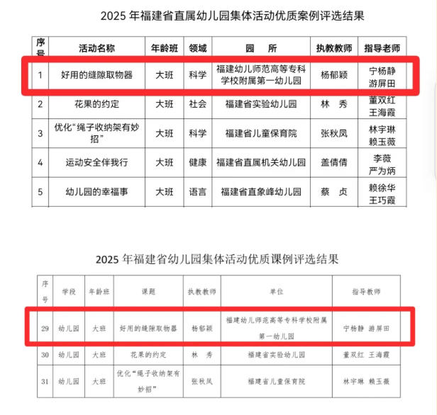 为全面贯彻落实党的二十大和全国教育大会精神,深入践行《3-6岁儿童学习与发展指南》《幼儿园保育教育质量评估指南》要求,不断提升幼儿园集体活动质量,福建省普通教育教学研究室组织开展了“2025年福建省幼儿园集体活动优质案例评选活动”。我园选送的《大班科学活动:好用的缝隙取物器》,通过现场说播、课例文本、课例视频三项内容的专家评审,以第一名的佳绩代表省属幼儿园进入省赛,最终从众多参赛案例中脱颖而出,荣获“2025年福建省幼儿园集体活动优质案例”。