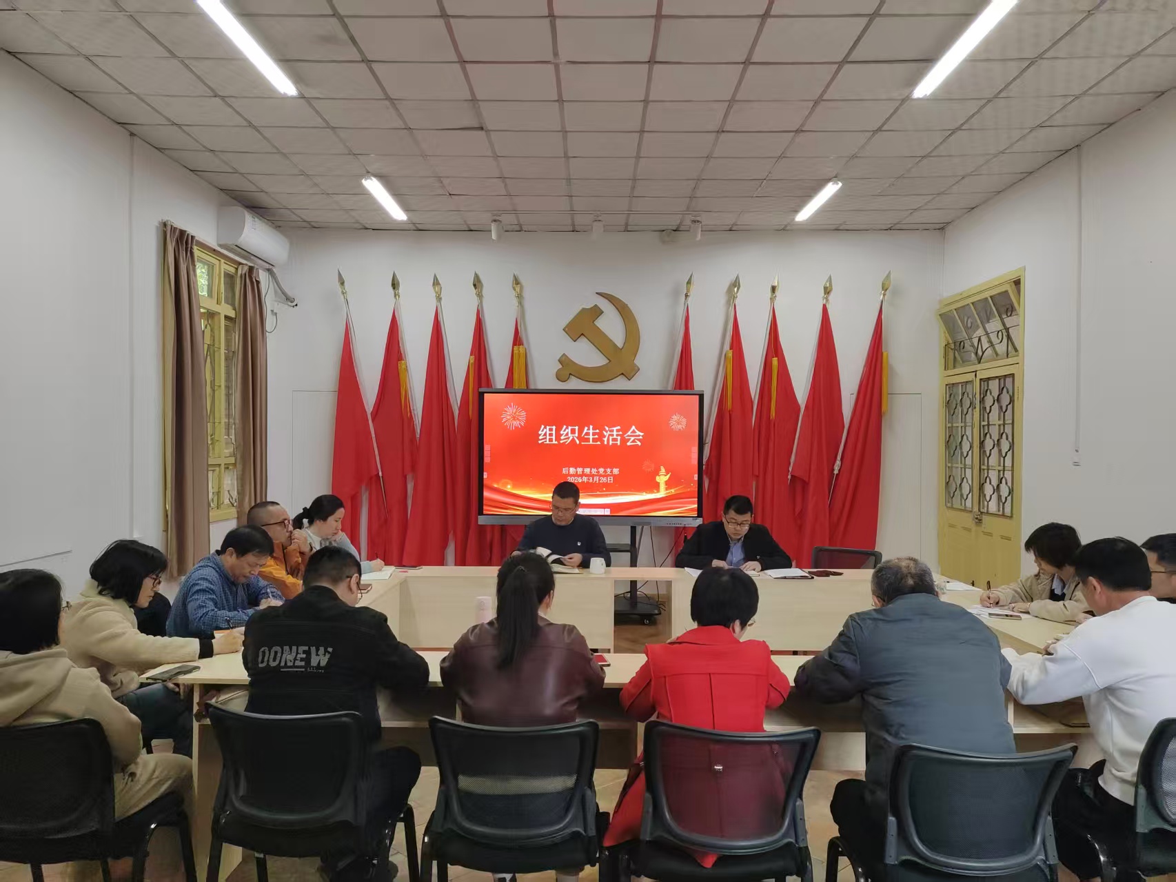 2026年3月26日上午,后勤管理处党支部召开2025年度组织生活会与党员民主评议工作。会议由后勤管理处党支部书记唐川主持。他代表支委会报告了2025年度支部工作情况以及2024年度组织生活会查摆问题整改落实情况,并作对照检查与个人检视剖析。全体党员同志逐一紧扣自身思想及工作实际,亮思想、摆问题,深刻剖析根源,不遮不掩自我批评、坦诚相见相互批评,达到了增强党性、凝聚共识、促进团结的目的。