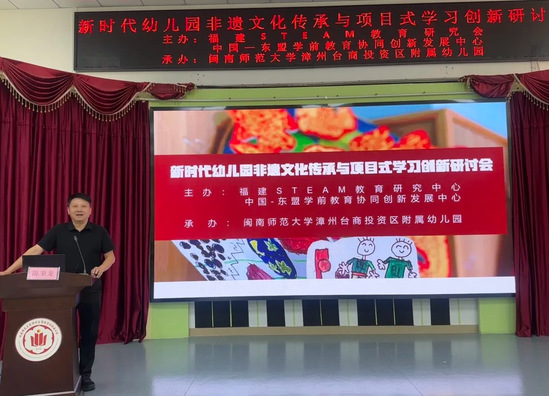 金秋送爽,硕果可期。2025年10月18日至19日,由福建STEAM教育研究中心联合中国东盟学前教育协同创新发展中心主办、闽师大附属幼儿园承办的“新时代幼儿园非遗文化传承与项目式学习创新研讨会”在闽南师范大学漳州台商投资区附属幼儿园成功举行。福建STEAM教育研究中心主任陈秉龙教授、中国东盟学前教育协同创新发展中心孙晓雷副主任、福建幼儿师范高等专科学校颜铭锋教授等教育领域专家,与闽师大附幼全体教师齐聚一堂,为幼儿园非遗文化传承落地与项目式学习(PBL)创新搭建深度交流平台。