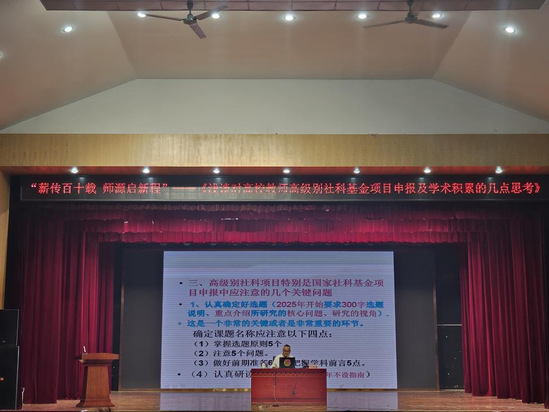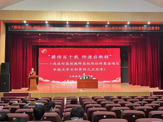 值此办学110周年之际,为深入落实高质量发展战略,助力教师提升科研创新能力与高级别项目申报水平,2025年11月26日下午,由科研处主办的“薪传百十载 师源启新程——《浅谈对高校教师高级别社科基金项目申报及学术积累的几点思考》”专题讲座在仓山校区礼堂成功举办。本次讲座为乐研讲坛第四期,特邀福建师范大学社科处原副处长、人文社科平台中心原副主任(正处级)何瑞鑫担任主讲。校党委副书记邹雄伟、副校长陈凤玉出席会议,全体专任教师到场聆听,讲座由学校科研处处长胥文玲主持。