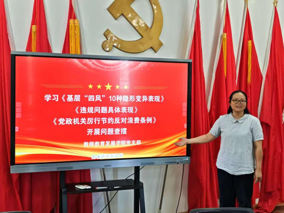 宣传委员沈艳容同志先后组织大家学习了《基层“四风”10种隐形变异表现》《违规问题具体表现》和《党政机关厉行节约反对浪费条例》。她采取“条文+案例”的方式,逐条剖析违规吃喝、快递送礼、虚列会议费等新型变异问题,现场发放《问题查摆表》,全体党员对照清单逐项自查、即知即改。沈艳容要求,对查摆出的问题要立行立改,并在两周内提交整改报告。
